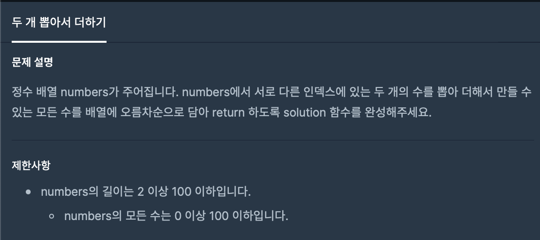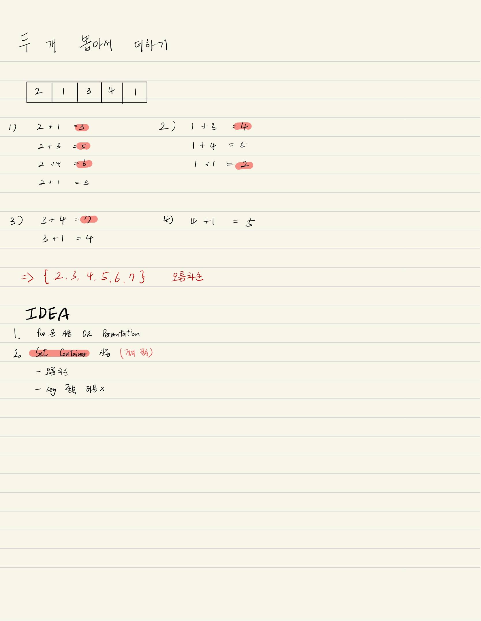 #include <string> #include <vector> #include <set> using namespace std; vector<int> solution(vector<int> numbers) { vector<int> answer; //set<int, greater<int>> numSet; 내림차순 표현법 set<int, less<int>> numSet; //오름차순 표현법 for(int i=0; i<numbers.size()-1; i++) // 첫번째 INDEX { for(int j=i+1; j<numbers.size(); j++) // 두번째 INDEX { int tmp = numbers[i] + numbers[j]; numSet.insert(tmp); } } for(auto a : numSet) //정렬된 값 vector에 삽입 { answer.push_back(a); } return answer; }=> C++에 있는 <set> 자료형을 사용할 수 있으면 간단히 풀 수 있는 문제였습니다.