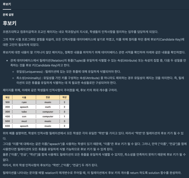 문제에 주어진 릴레이션과 같으며, 후보 키는 2개이다.#include <string> #include <vector> #include <map> #include <algorithm> #include <set> using namespace std; bool check(vector<int> vec, int now) { for(int i=0; i<vec.size(); i++) { if((vec[i] & now) ==vec[i]) { return false; } } return true; } int solution(vector<vector<string>> relation) { int answer = 0; int rowSize = (int)relation.size(); int colSize = (int)relation[0].size(); vector<int> ans; for(int i=1; i< (1<<colSize); i++) { set<string> s; for(int j=0; j<rowSize; j++) { string now=""; for(int k=0;k<colSize;k++) { if(i & (1<<k)) { now += relation[j][k]; } } s.insert(now); } if(s.size() == rowSize && check(ans, i)) ans.push_back(i); } return (int)ans.size(); }반응형'프로그래머스(Programmers)' 카테고리의 다른 글