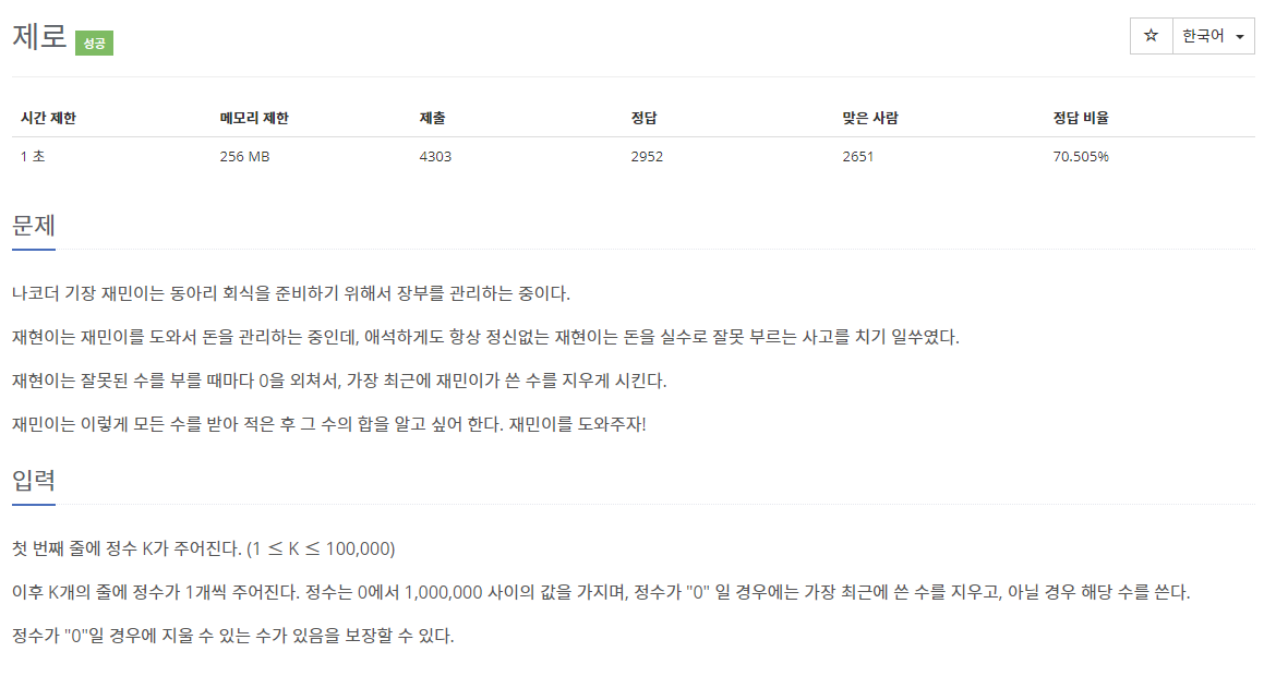 stack에 대한 개념을 알고 있어야한다. 예외처리가 필요 없는 문제라 쉬웠다.#include <iostream> #include <stack> using namespace std; int main() { int num; //입력받을 명령어 갯수 변수 int command; // 명령어 변수 int val=0; // 최종값 변수 cin >> num; stack<int> stack; for (int i = 0; i < num; i++) { cin >> command; if (command == 0) { stack.pop(); } else { stack.push(command); } } while (!stack.empty())//empty면 true를 반환한다 { val += stack.top(); stack.pop(); } cout << val << '\n'; return 0; }반응형'백준 algorithm' 카테고리의 다른 글
