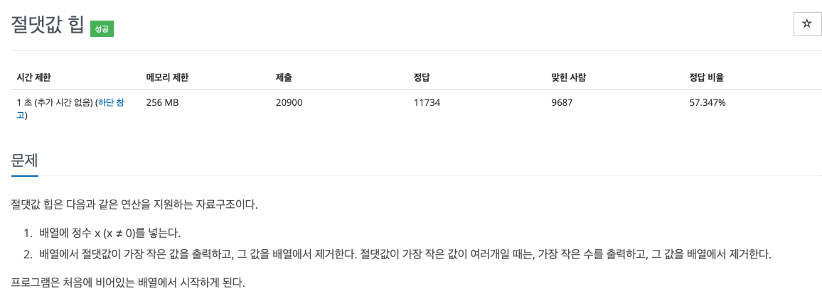 입력에서 0이 주어진 회수만큼 답을 출력한다. 만약 배열이 비어 있는 경우인데 절댓값이 가장 작은 값을 출력하라고 한 경우에는 0을 출력하면 된다.