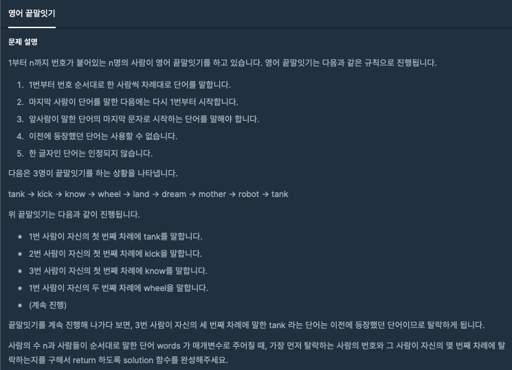 - 끝말잇기에 참여하는 사람의 수 n은 2 이상 10 이하의 자연수입니다.