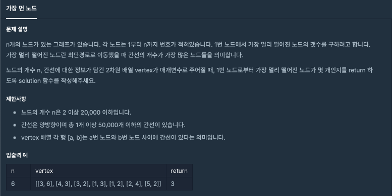 #include <string> #include <vector> #include <queue> #include <algorithm> using namespace std; int solution(int n, vector<vector<int>> edge) { int answer = 0; vector<vector<int>> graph(n+1); for(auto ed : edge) { int from = ed[0]; int to = ed[1]; graph[from].push_back(to); graph[to].push_back(from); } vector<int> dist(n+1, -1); queue<int> q; dist[1] = 0; q.push(1); int max =0; while(!q.empty()) { int cur = q.front(); q.pop(); for(auto i : graph[cur]) { if(dist[i] == -1)//가본적이 없으면 { dist[i] = dist[cur]+1; if(max < dist[i]) max = dist[i]; q.push(i); } } } sort(dist.begin(),dist.end()); for(auto k : dist) { if(max == k )answer++; } return answer; }반응형'프로그래머스(Programmers)' 카테고리의 다른 글