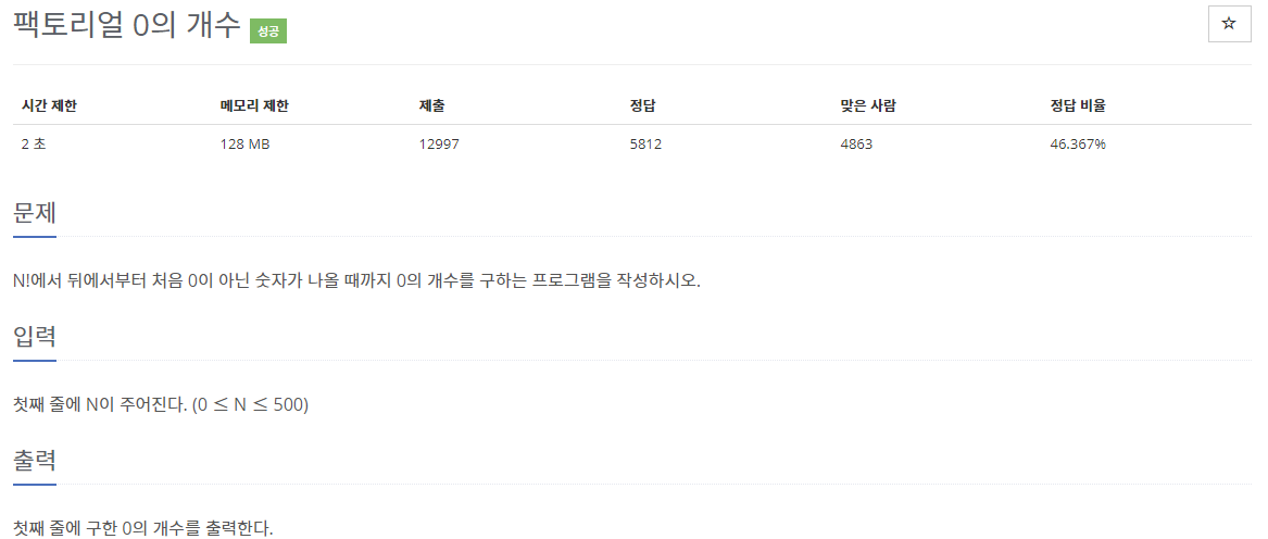 2와 5가 하나씩 짝을 이루어야 0이 되므로 2의 개수와 5의 개수중 최소값을 구하면 되는 문제이다.*알고리즘은 쉽게 짰으나, 코딩에서 시간이 걸렸다.