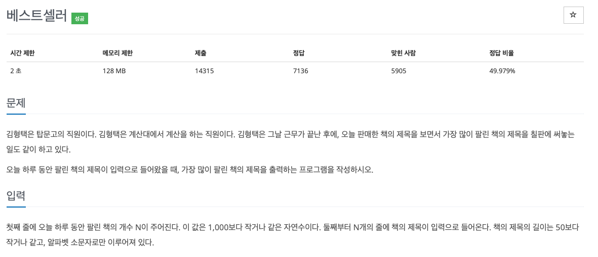 첫째 줄에 가장 많이 팔린 책의 제목을 출력한다. 만약 가장 많이 팔린 책이 여러 개일 경우에는 사전 순으로 가장 앞서는 제목을 출력한다.