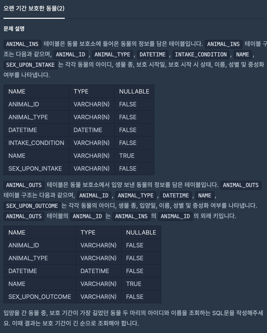 예를 들어, ANIMAL_INS 테이블과 ANIMAL_OUTS 테이블이 다음과 같다면