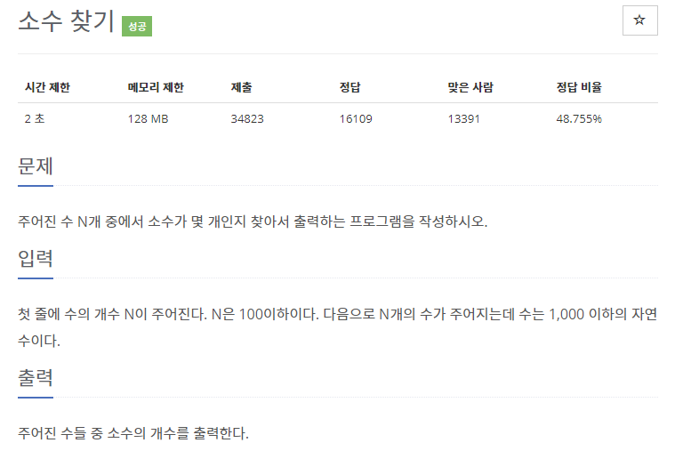 소수의 조건을 만족하는지 아닌지에 대한 함수를 만들어 해결하였다.#include <iostream> using namespace std; bool Prime_Num(int num) { if (num == 1)return false; else if (num == 2)return true; else{ for (int i = 2; i < num; i++) { if (num % i == 0)return false; } return true; } } int main() { int N; int count = 0; int temp; cin >> N; for (int i = 0; i < N; i++) { cin >> temp; if (Prime_Num(temp) == true)count++; } cout << count << endl; return 0; }반응형'백준 algorithm' 카테고리의 다른 글