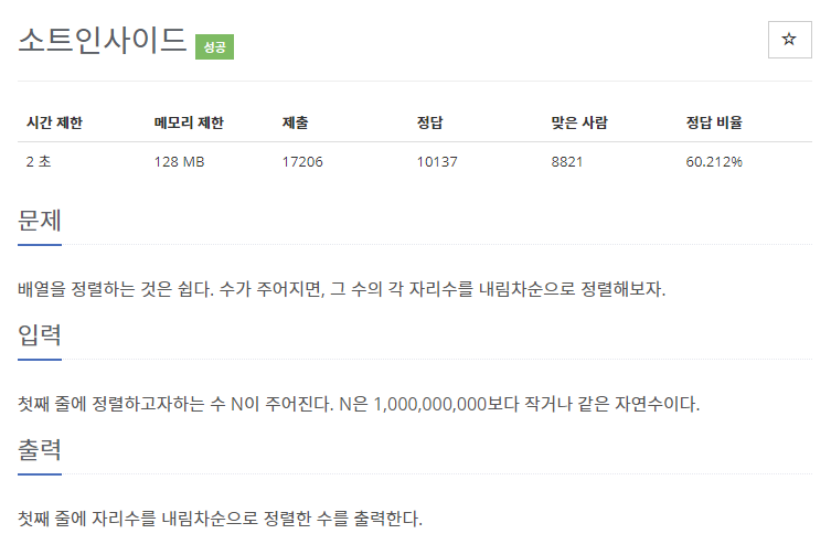 #include <algorithm>#include <iostream> #include <vector> #include <algorithm> using namespace std; int main() { vector<int> arr;//숫자 입력받을 vector 선언 int N; //입력받을 숫자 cin >> N; while (N > 10) //각자리의 숫자를 vector에 삽입 { int tmp; tmp = N % 10; arr.push_back(tmp); N = N / 10; } arr.push_back(N); sort(arr.begin(), arr.end(), greater<int>());//배열 sorting for (int i = 0; i < arr.size(); i++) { cout << arr[i]; } return 0; }반응형'백준 algorithm' 카테고리의 다른 글