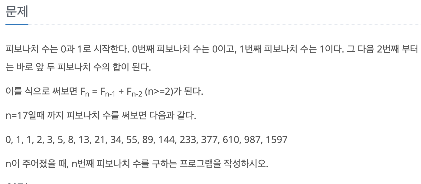 문제 설명 이제까지는 for문으로 피보나치를 구현하였다. 이럴 때의 문제는 숫자가 커질수록 걸리는 시간이 기하학적으로 커지는 것이다.