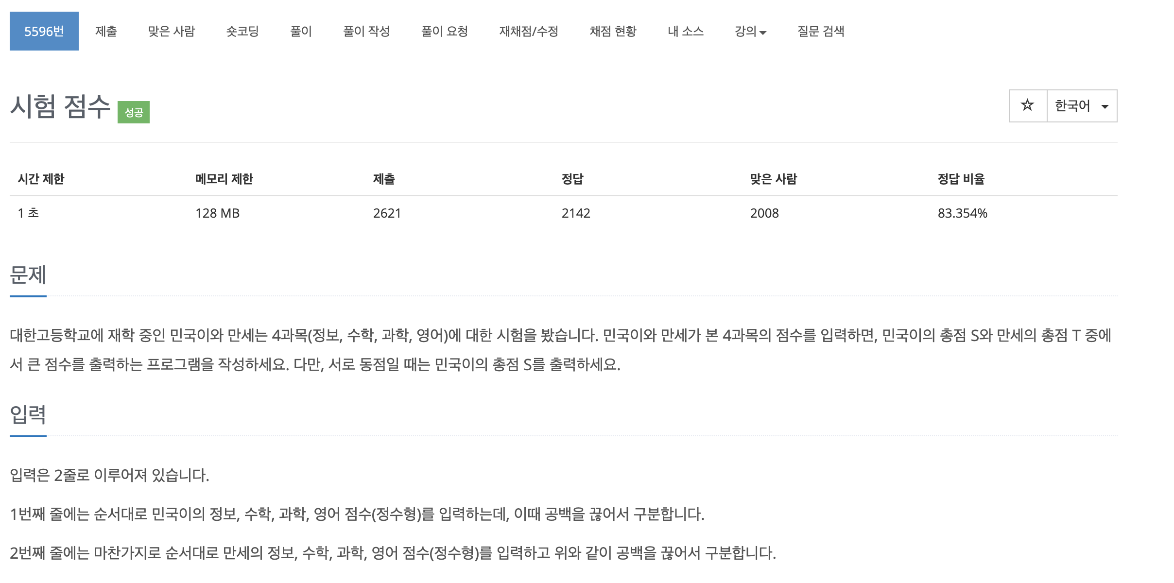 #include <iostream> #include <vector> using namespace std; int main() { int Kook, Sae=0; int j,s,k,y; cin>>j>>s>>k>>y; Kook=j+k+s+y; cin>>j>>s>>k>>y; Sae=j+k+s+y; if(Kook>=Sae)cout<<Kook<<'\n'; else cout<<Sae<<'\n'; return 0; }반응형'백준 algorithm' 카테고리의 다른 글