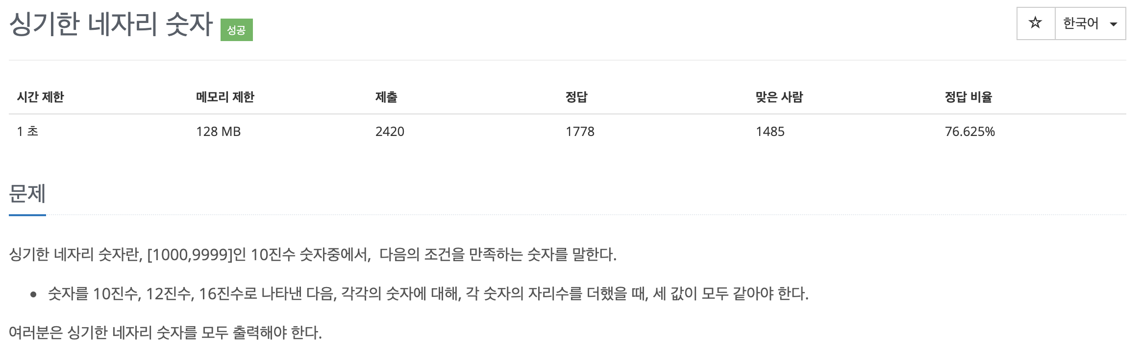 #include <iostream> #include <vector> #include <utility> #include <algorithm> using namespace std; int find10(int N) { int tem=10; int val=0; while(N>0) { val+=N%tem; N/=tem; } return val; } int find16(int N) { int tem=16; int val=0; while(N>0) { val+=N%tem; N/=tem; } return val; } int find12(int N) { int tem=12; int val=0; while(N>0) { val+=N%tem; N/=tem; } return val; } int main() { ios_base::sync_with_stdio(false); cin.tie(nullptr); cout.tie(nullptr); for(int i=1000; i<=9999; i++) { if(find10(i)==find12(i) && find12(i) == find16(i) && find16(i)==find10(i)) cout<< i <<'\n'; } }반응형'백준 algorithm' 카테고리의 다른 글