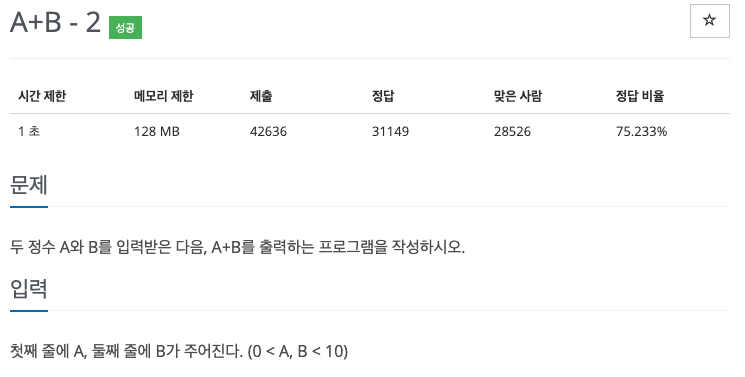 문제 설명 #include <iostream> #include <vector> #include <utility> #include <algorithm> using namespace std; int main() { ios_base::sync_with_stdio(false); cin.tie(nullptr); cout.tie(nullptr); int A, B; cin >>A>>B; cout<<A+B; }반응형'백준 algorithm' 카테고리의 다른 글