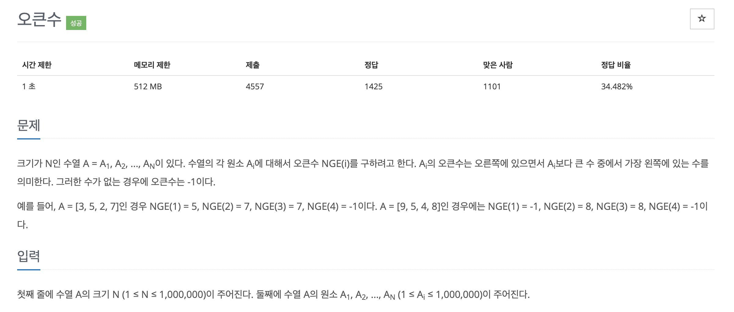 =>현재 index에 들어있는 값이 stack의 top index에 해당하는 값보다 크면 해당 top index의 오큰수를 찾게 된다.