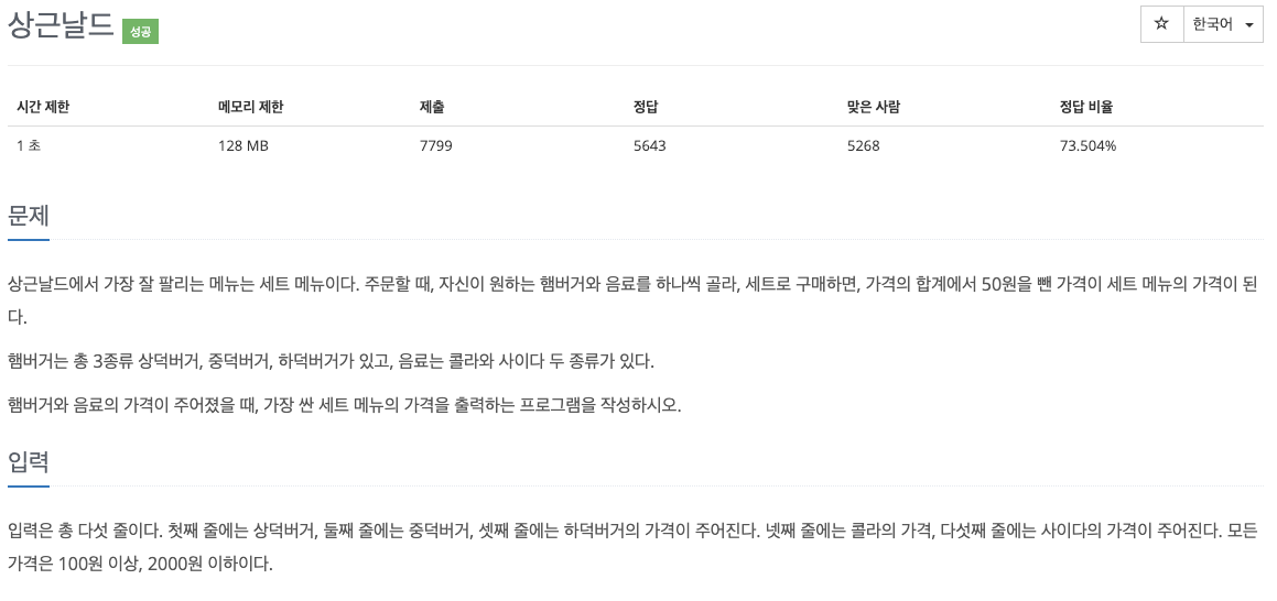 문제 설명 #include <iostream> #include <stack> #include <string> #include <vector> #include <algorithm> using namespace std; int main() { ios_base::sync_with_stdio(false); cin.tie(nullptr); cout.tie(nullptr); int Burger[3]; int Drink[2]; int MinB=2001; int MinD=2001; for(int i=0;i<3; ++i) { cin>>Burger[i]; if(Burger[i]<MinB)MinB=Burger[i]; } for(int j=0; j<2; ++j) { cin>>Drink[j]; if(Drink[j]<MinD)MinD=Drink[j]; } cout<<MinD+MinB-50<<'\n'; return 0; }반응형'백준 algorithm' 카테고리의 다른 글